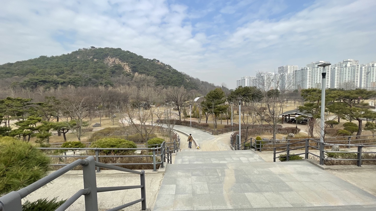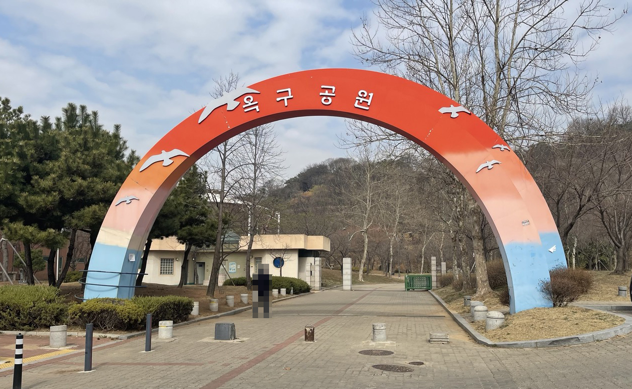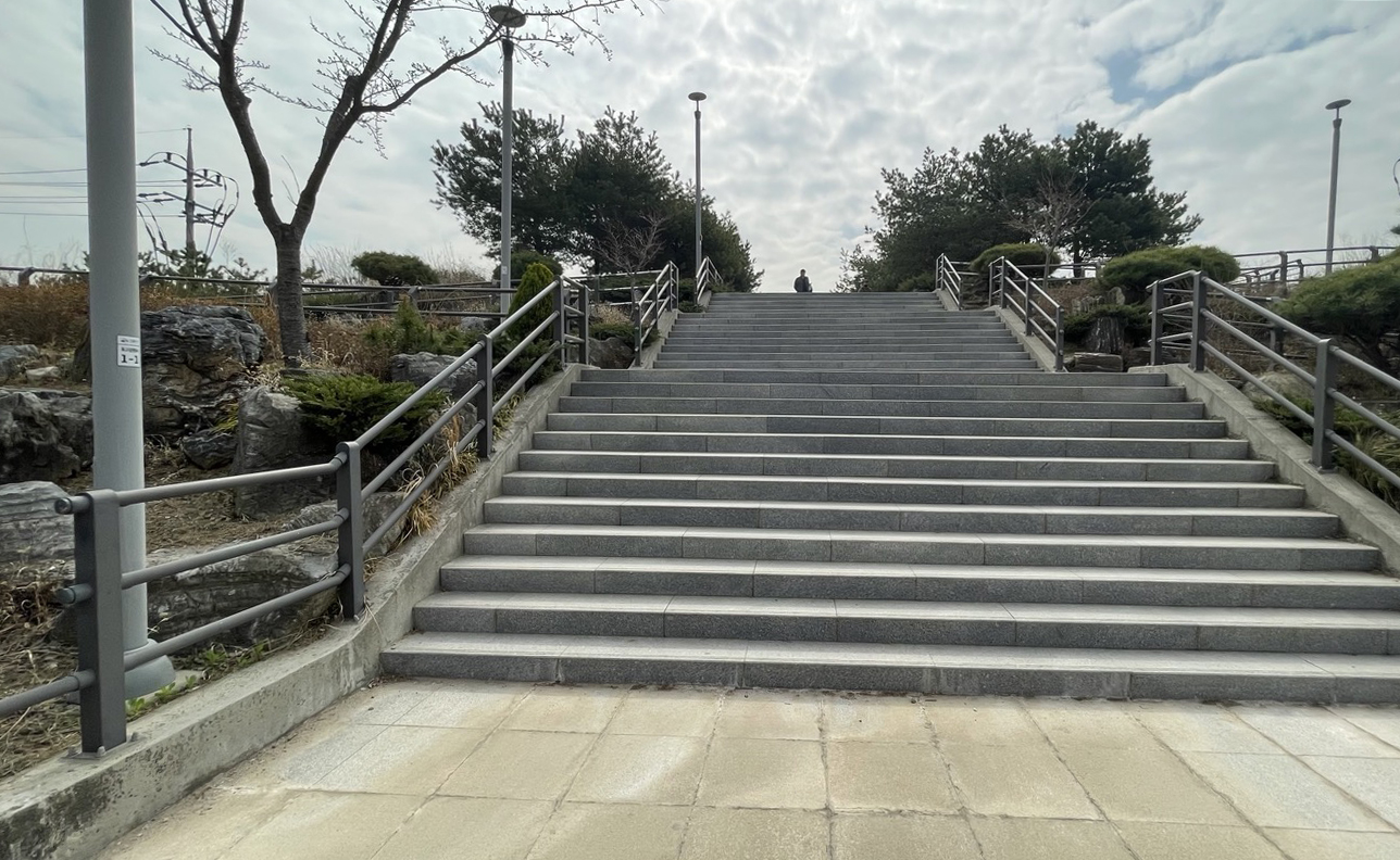 옥구공원 안쪽으로 조금 걸어 들어오면 보행교로 올라가는 계단이 나옵니다.