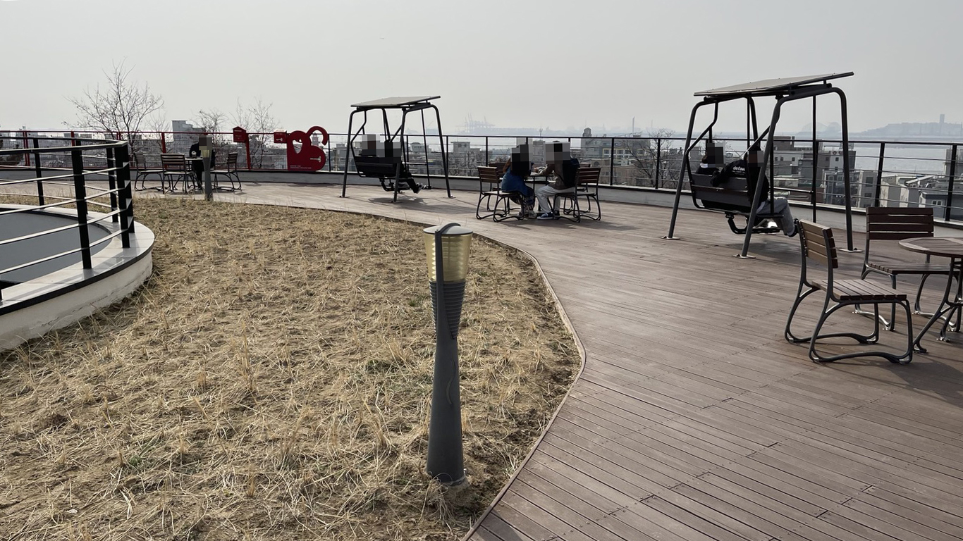 전망대 모습입니다. 그네형 벤치와 테이블들이 놓여 있어요.