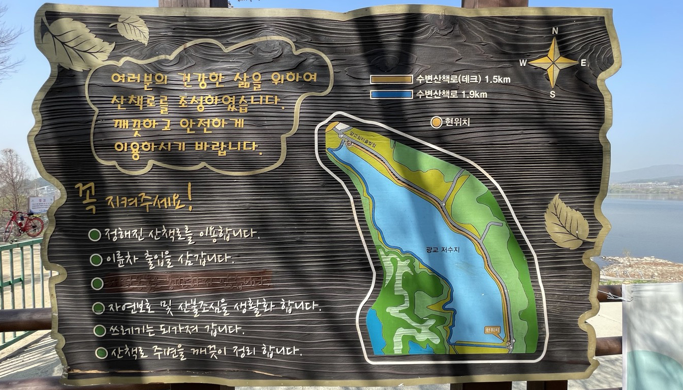광교저수지 둘레는 나무데크 산책로 1.5km, 일반 산책로 1.9km로 구성된 총 3.4km의 산책로로 조성되어 있습니다.