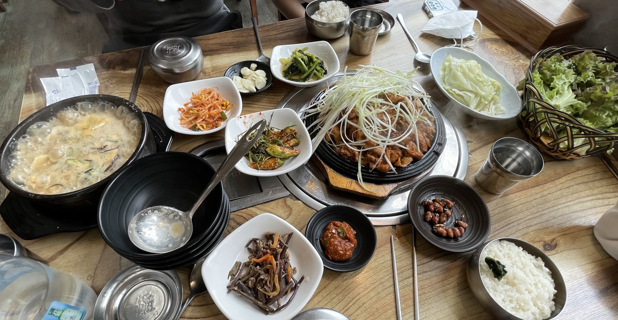 파채가 얹혀진 연탄불고기가 푸짐하게 나왔습니다. 식사에 포함된 청국장도 양이 넉넉하게 나와요.