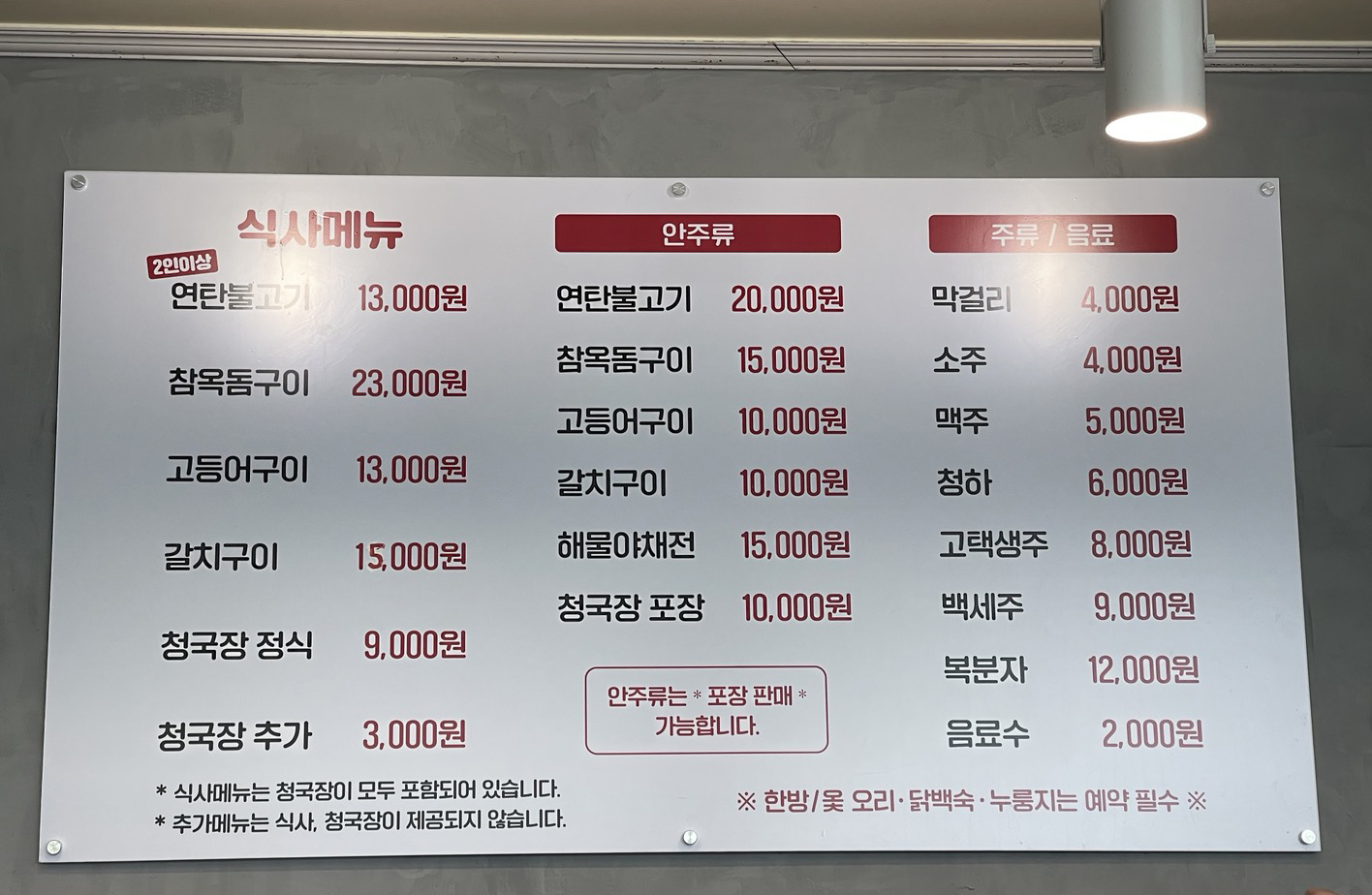 수리골의 주 메뉴는 연탄불고기와 생선구이 입니다. 모든 식사메뉴에는 기본적으로 청국장이 포함되어 있습니다.