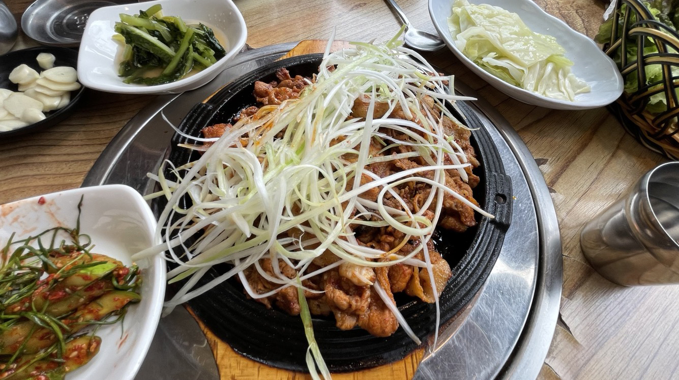 파채가 얹혀진 연탄불고기가 푸짐하게 나왔습니다. 식사에 포함된 청국장도 양이 넉넉하게 나와요.