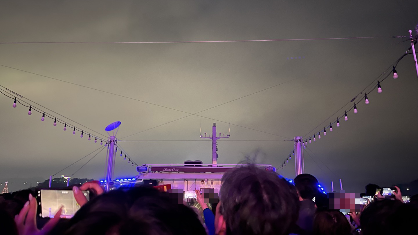 머리 바로 위에서 폭죽이 터지기 때문에 배 후반부에 자리를 잡는 것이 불꽃쇼 관람할 때 목이 좀 편합니다.
