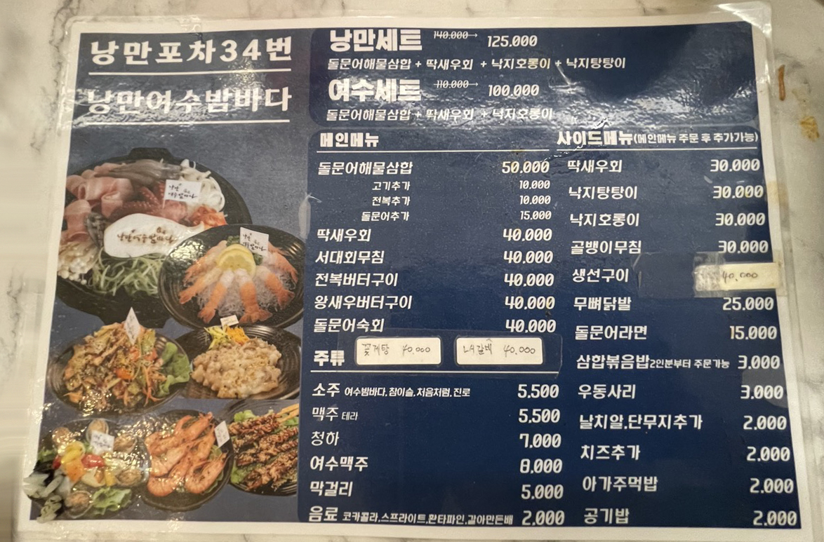 낭만포차34번 낭만여수밤바다 메뉴입니다.