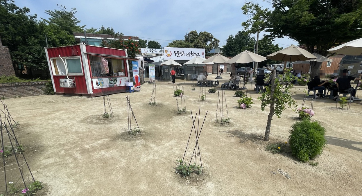 앞쪽으로 의자와 파라솔, 테이블 몇 개가 마련되어 있습니다.