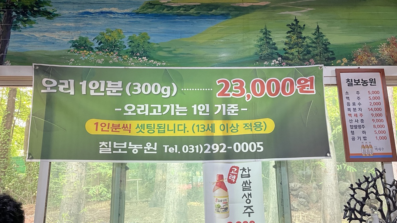 오리고기 1인분에 23,000원. 13세 이상부터는 1인당 1인분 필수 주문입니다.