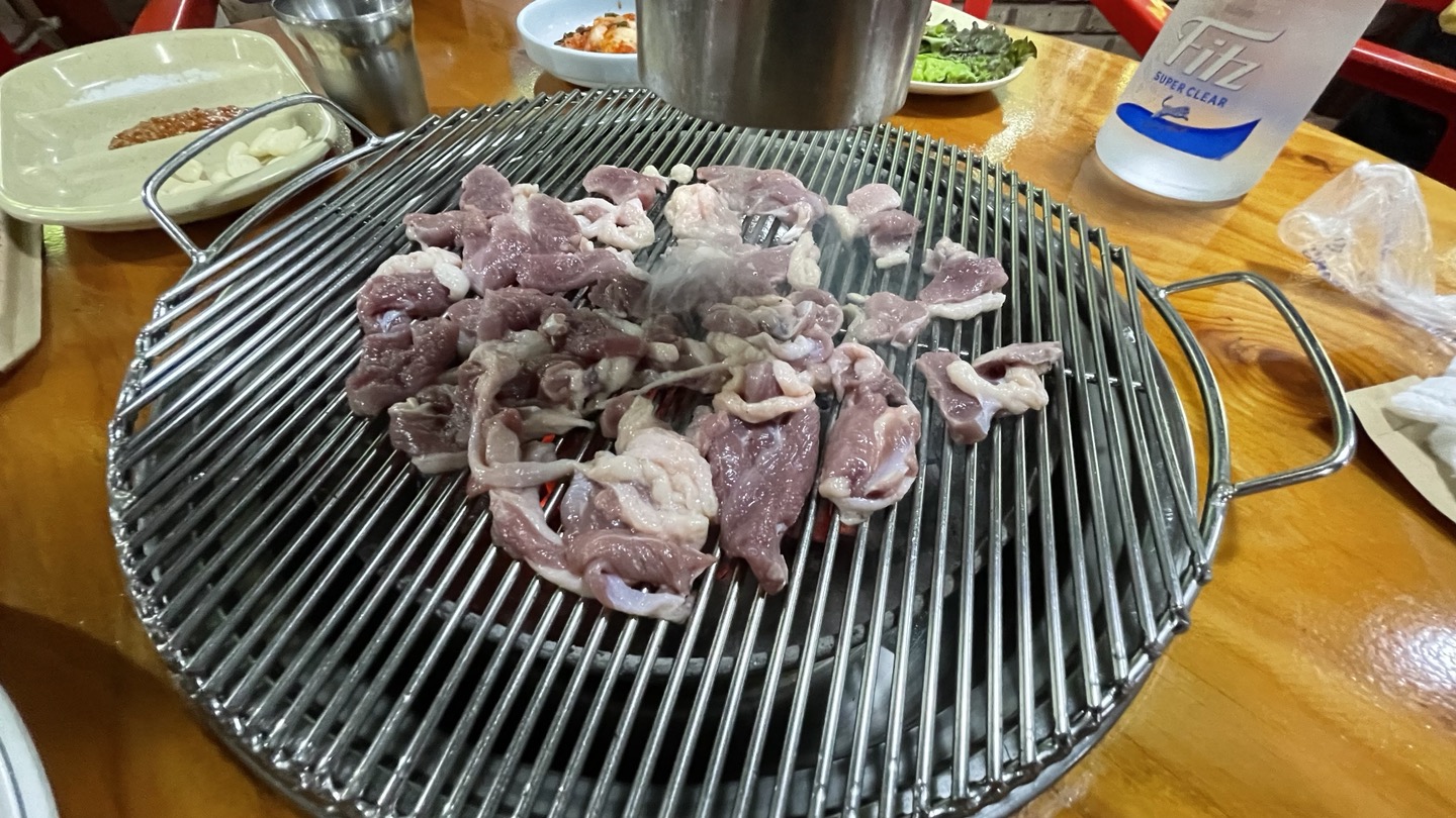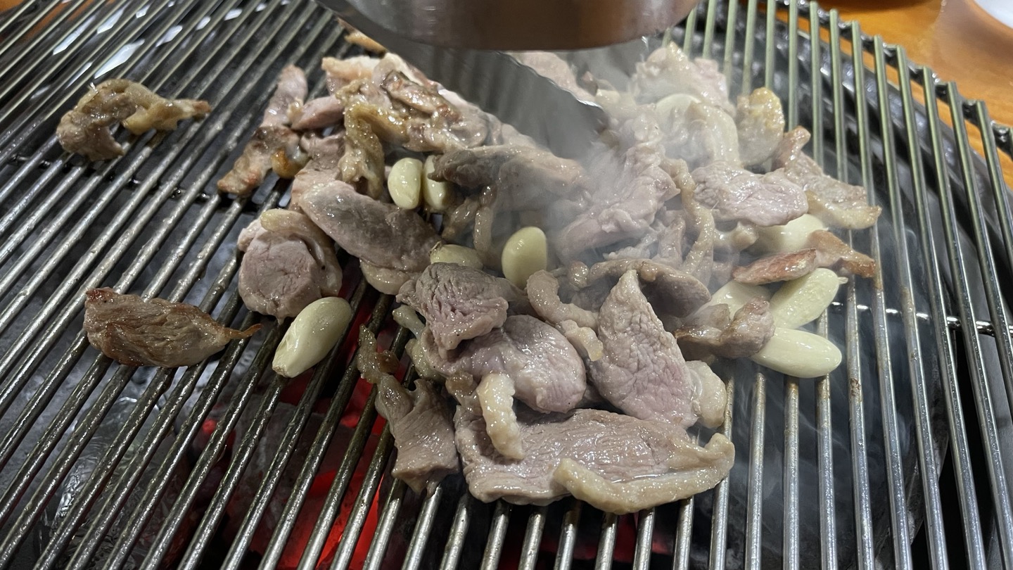 숯불에 오리고기와 마늘을 올리고 같이 제공되는 굵은 소금을 살살 뿌려 볶듯이 구워주면 됩니다.