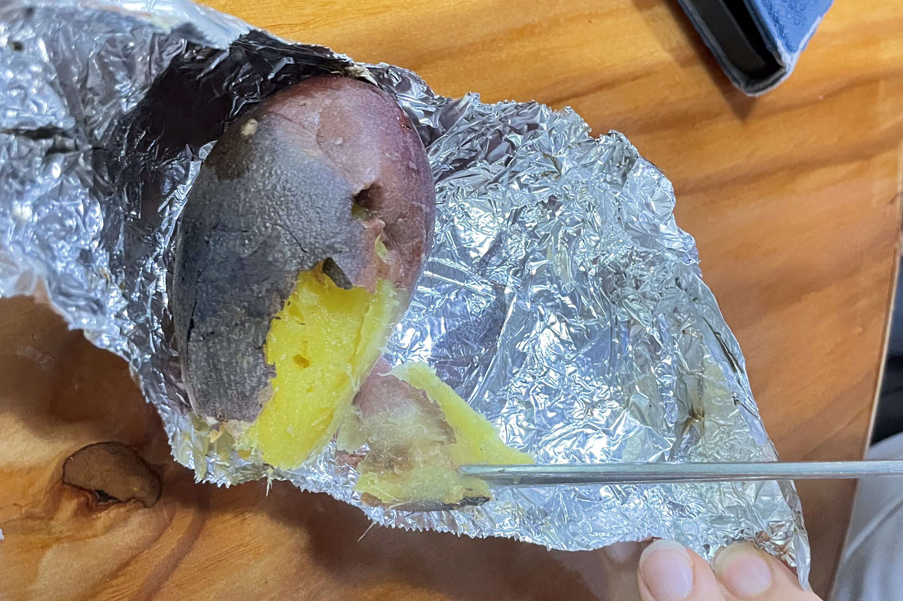 그러는 사이, 숯불에 넣어둔 고구마가 맛있게 잘 익었습니다.