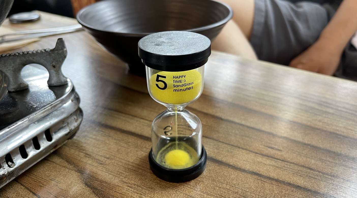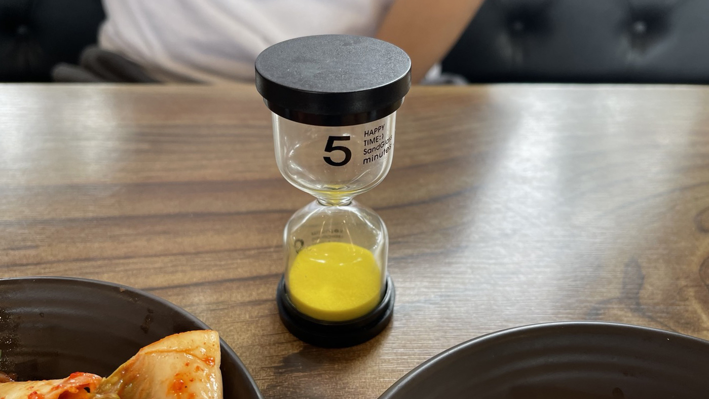 칼국수가 나올 때 쨍하게 이쁜 노란색의 모래가 들어있는 모래시계가 같이 나오는데요.