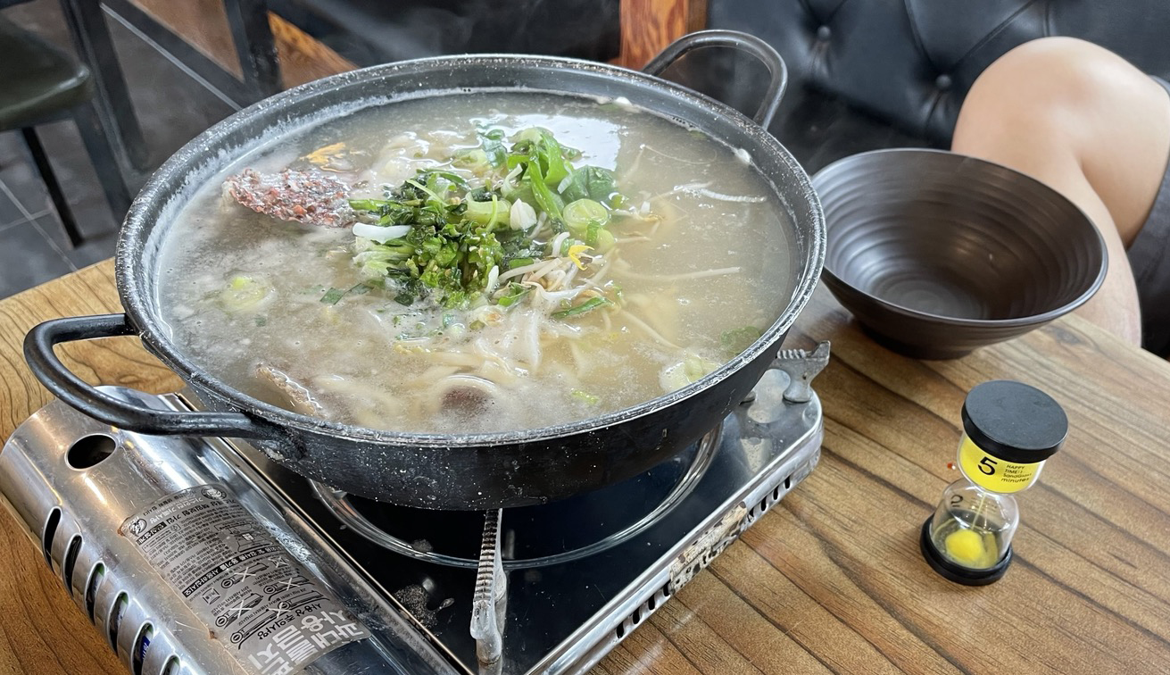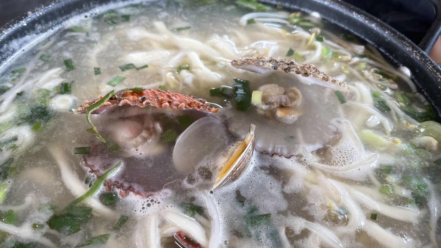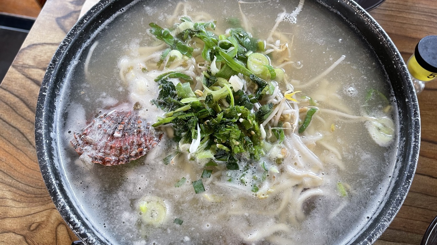 주문한 '와각칼국수'가 나왔습니다. 와각칼국수는 모둠조개가 들어간 메뉴에요.
