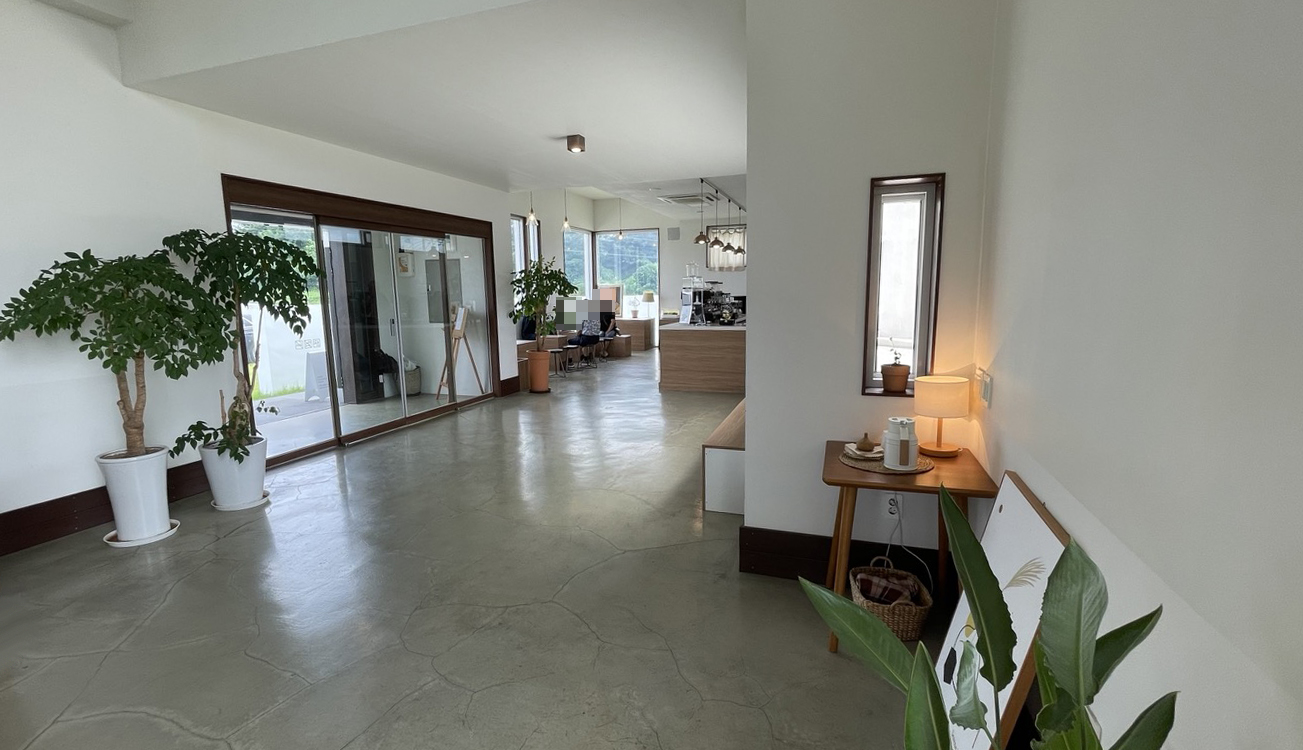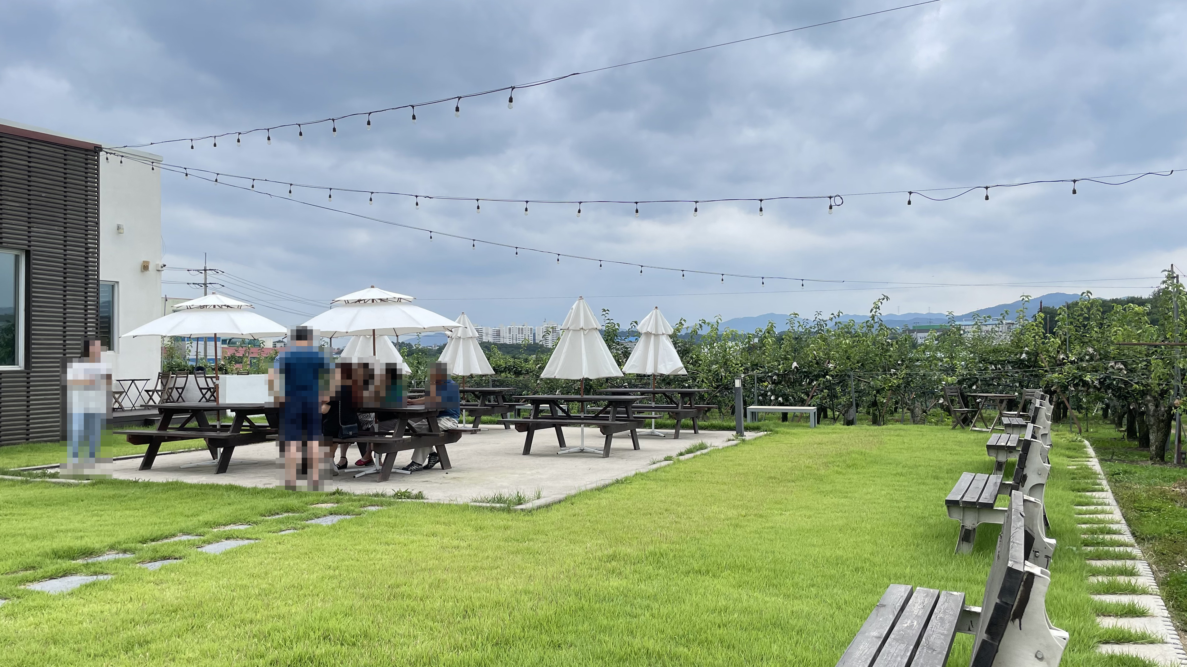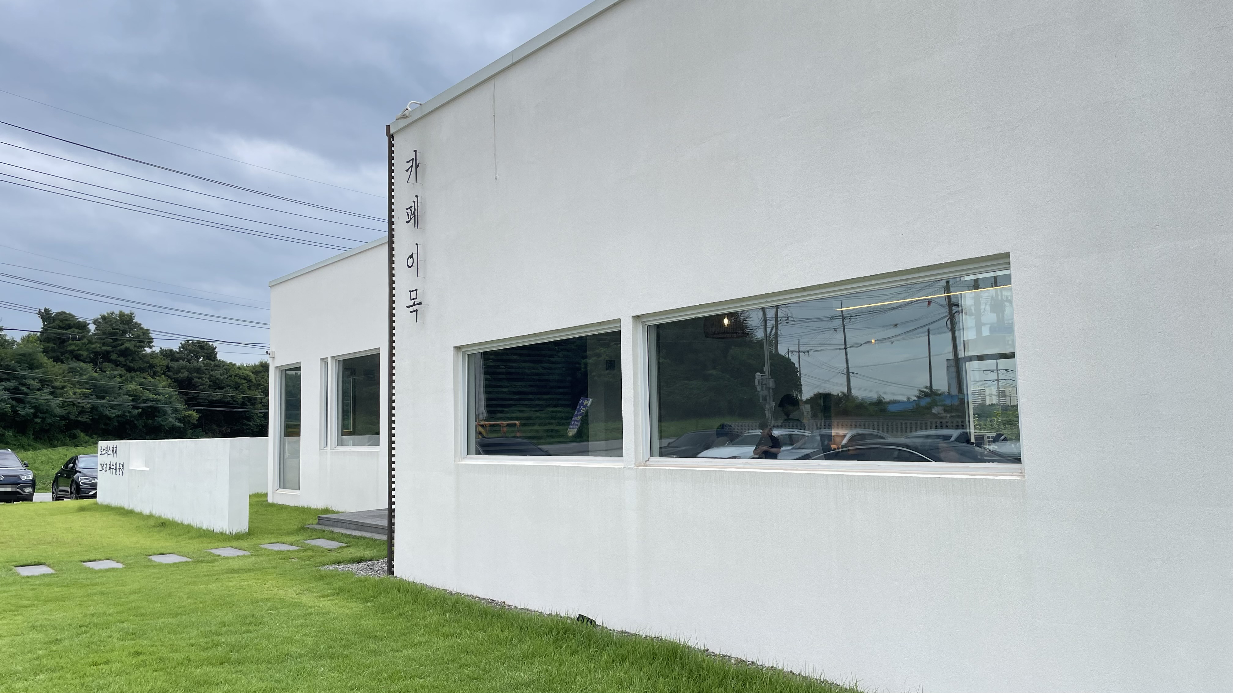 푸른 잔디밭 위에 세워진 흰색 카페 건물이 인상적입니다.