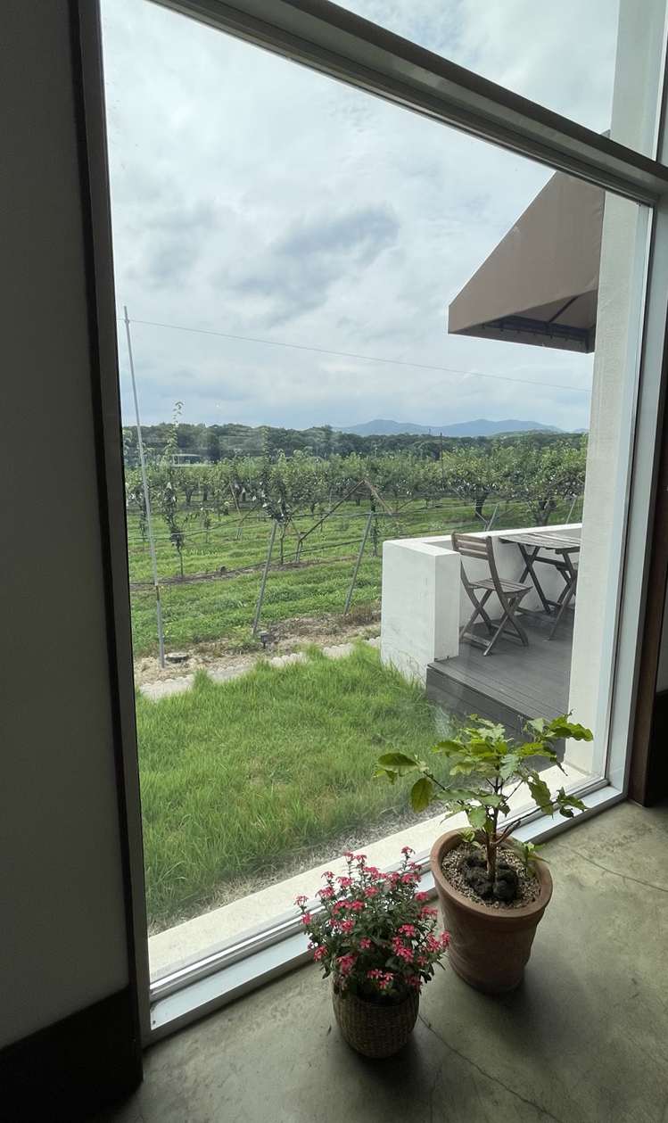 창 밖으로 넓게 펼쳐진 배밭이 보입니다.