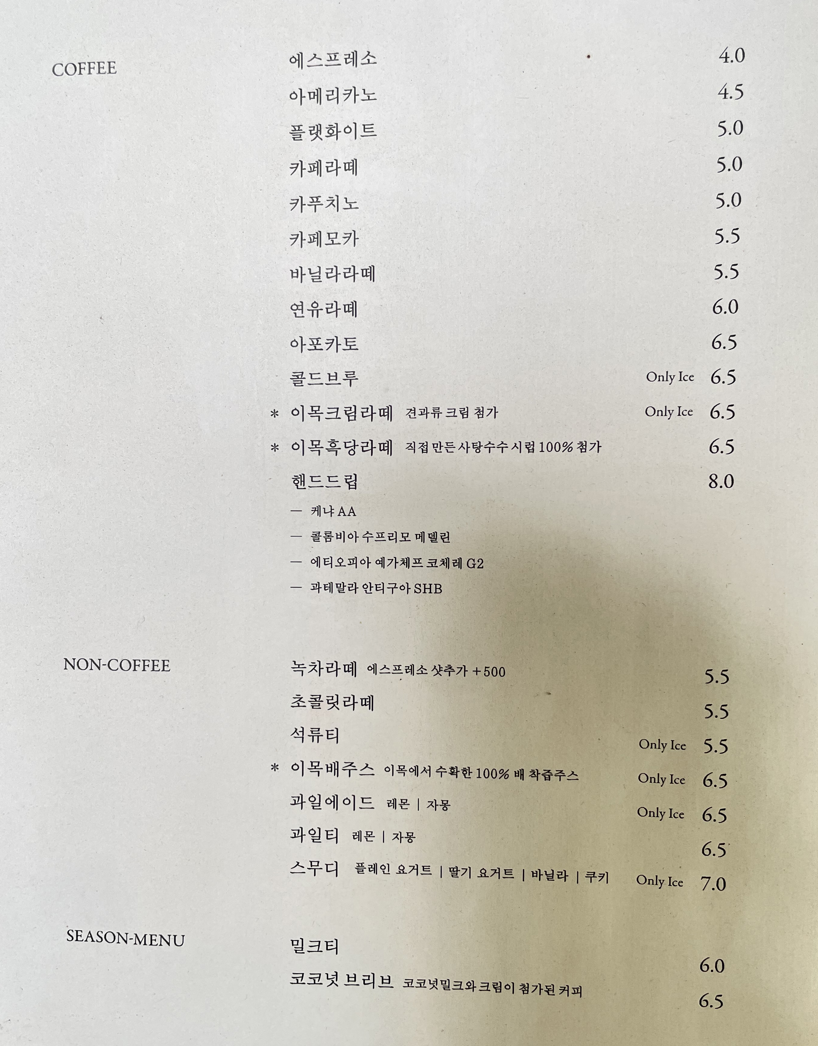 카페이목 메뉴에요.
