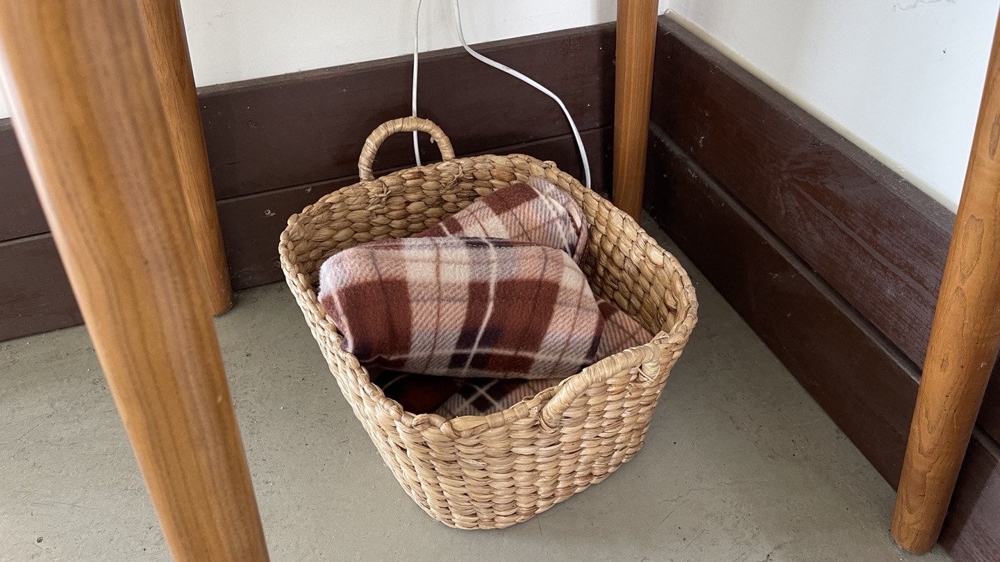 카페 한 쪽에 마실 물과 티슈, 무릎담요가 준비되어 있습니다.