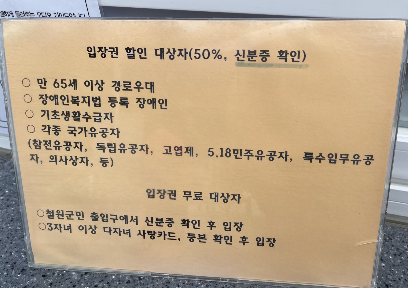 | 일반인 | 입장료 | 10,000원 | 4,000원 | *입장료 무료 대상 : 만5세 이하 미취학 아동, 다자녀(3자녀 이상), 철원군민 등 *할인 대상자 : 만65세 이상, 기초생활수급자, 유공자, 장애인, 병역명문가 등 *단체 : 25인 이상 |