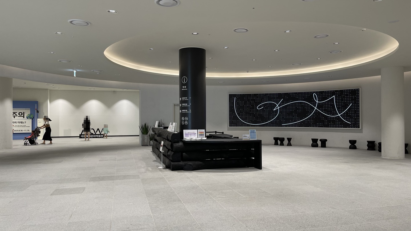 관람동선은 지하부터 시작되기 때문에 1층 로비에서 지하로 내려갑니다.