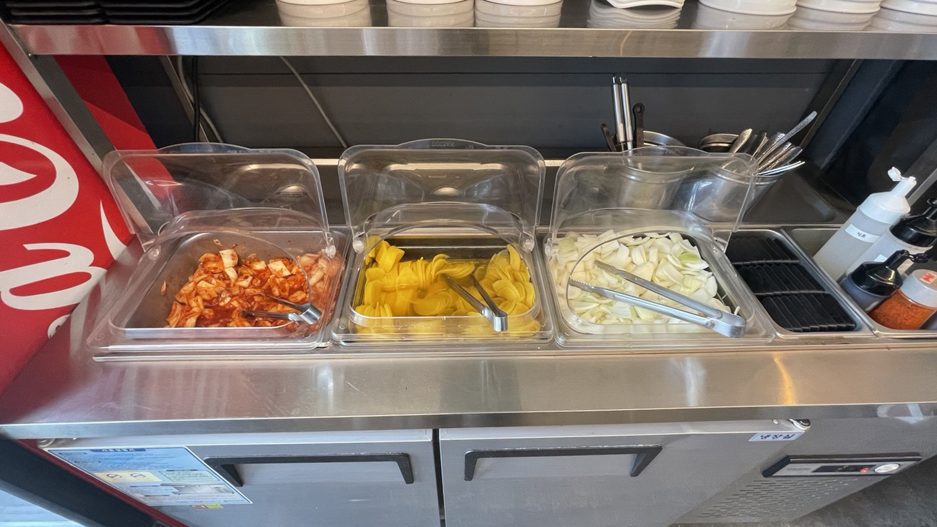 밑반찬은 단무지, 양파, 김치가 준비되어 있습니다. 부족한 반찬은 셀프코너를 이용하면 되고요.