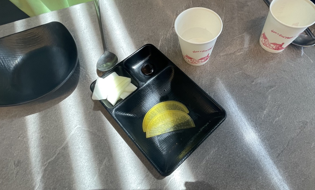 밑반찬은 단무지, 양파, 김치가 준비되어 있습니다. 부족한 반찬은 셀프코너를 이용하면 되고요.