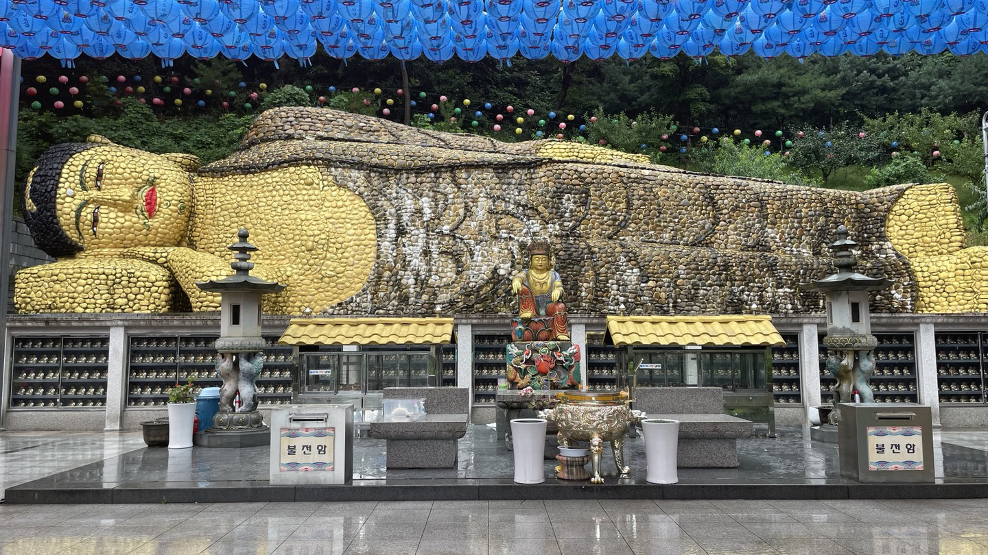 - 와불(臥佛): 누워 있는 부처님 상으로, 몽돌(조약돌)로 만든 국내에서도 보기 드문 형태예요.
