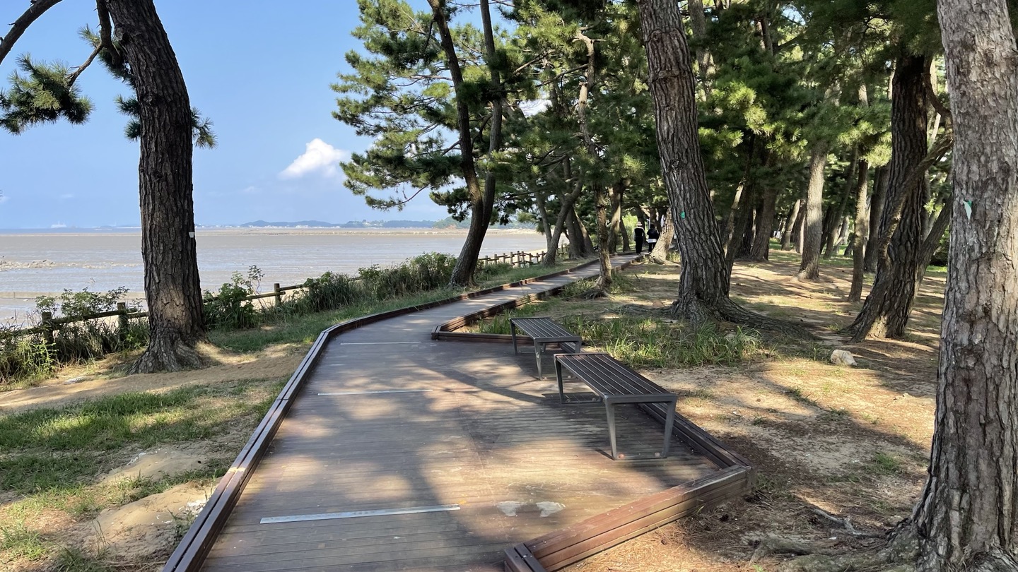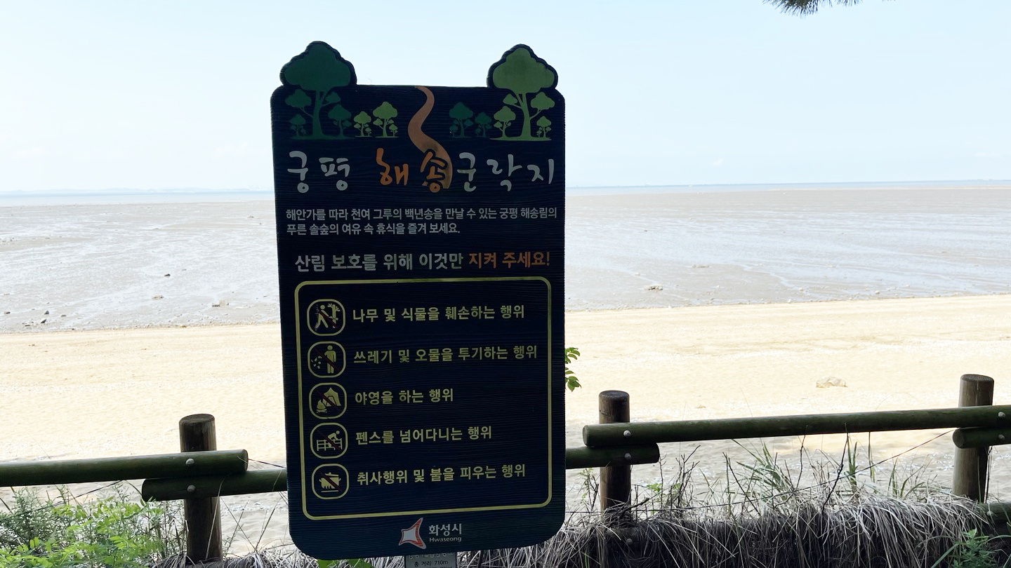 이 곳은 궁평 해송군락지로, 해안가를 따라 형성된 천여 그루의 백년송 사이를 산책할 수 있는 곳입니다.