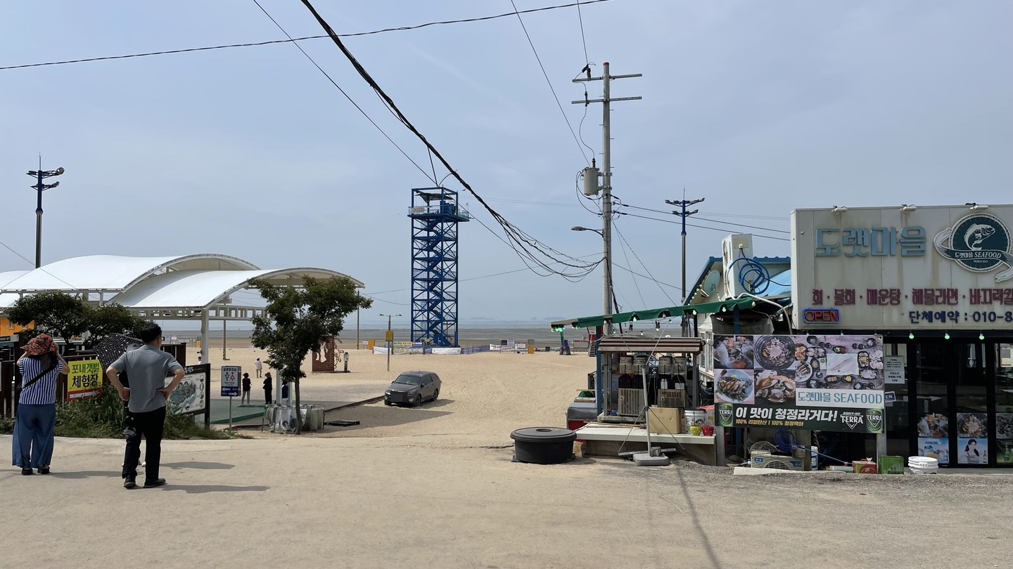 상가들과 전선들, 짚라인으로 인해 해변 풍경이 어수선해서 그런지 하나개 해수욕장의 첫인상이 그리 좋지는 않았습니다.