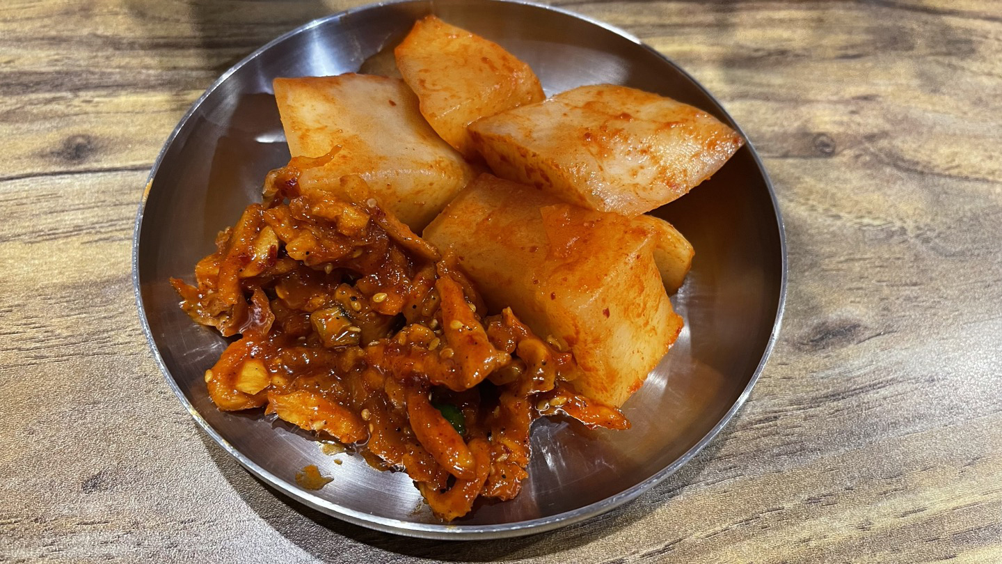 셀프코너에 있는 무말랭이 무침을 가져왔어요. 달지 않고 독특하게 맛있어요.