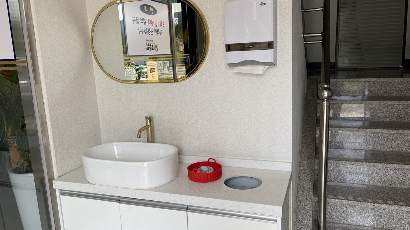 건물 현관을 들어서면 식당 출입구 앞에 세면대가 준비되어 있어요. 식당으로 들어가기 전에 손을 씻고 들어갈 수 있어 좋았어요.^^