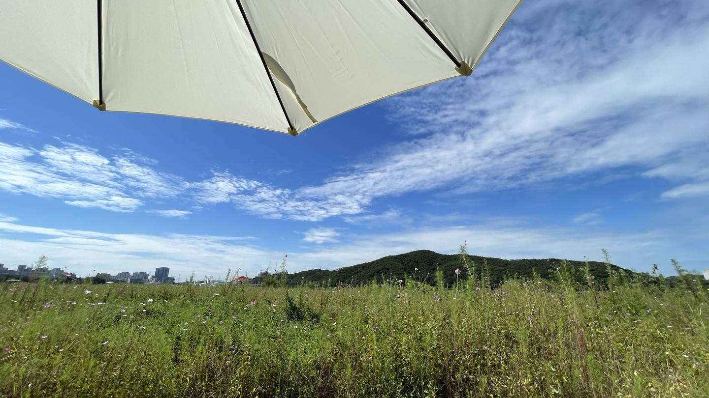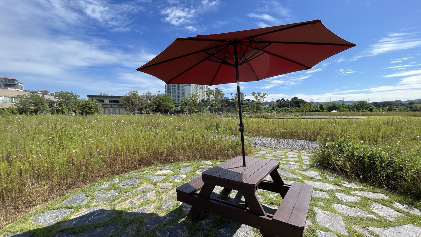 코스모스밭 중간중간에 파라솔과 벤치가 있어요. 편의점에 들러 커피 한잔 준비해 오면 좋을 것 같아요.^^