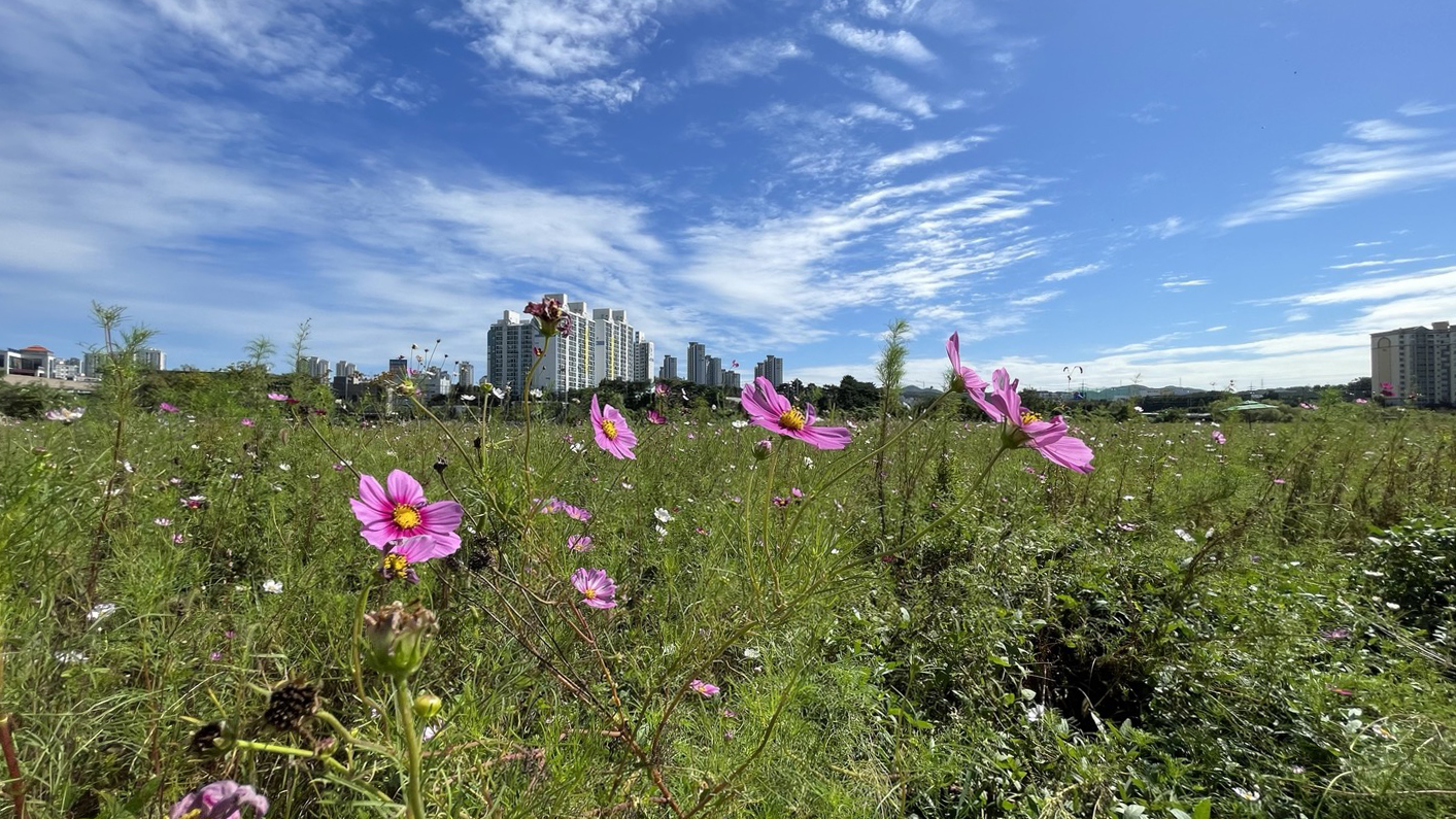 아직 활짝 피지는 않았지만, 간간히 바람에 흔들리는 코스모스가 가을의 정취를 더해줍니다.
