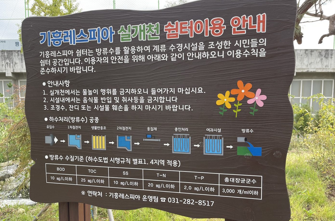 '레스피아'는 휴식을 의미하는 '레스트(Rest)'와 이상향을 뜻하는 '유토피아(Utopia)'를 합성해서 만든 용어로, 단순한 하수처리시설이 아닌 시민친화시설을 조성하려는 용인시 하수처리의 신개념을 타나내는 표현입니다. 기흥레스피아 옆에도 방류수를 활용하여 쉼터공간을 조성해 놓았습니다.