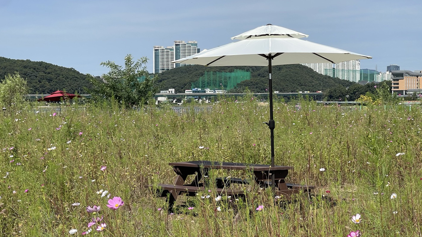 코스모스밭 중간중간에 파라솔과 벤치가 있어요. 편의점에 들러 커피 한잔 준비해 오면 좋을 것 같아요.^^