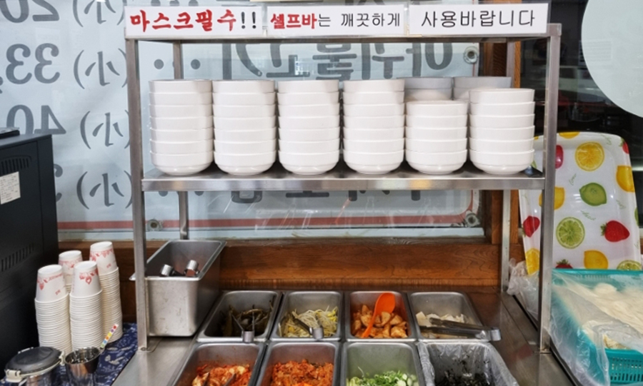 셀프바에 있는 소면과 밑반찬이에요. 소면은 양껏 먹을 수 있어요. 소면을 낚지볶음 양념에 넣어 먹어도 맛있더라고요.^^