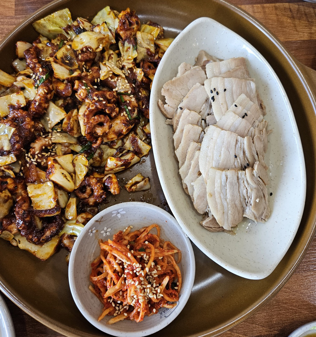 낙지볶음과 돼기고기 보쌈이 같이 나옵니다. 보쌈보기도 부드럽고 맛있습니다.