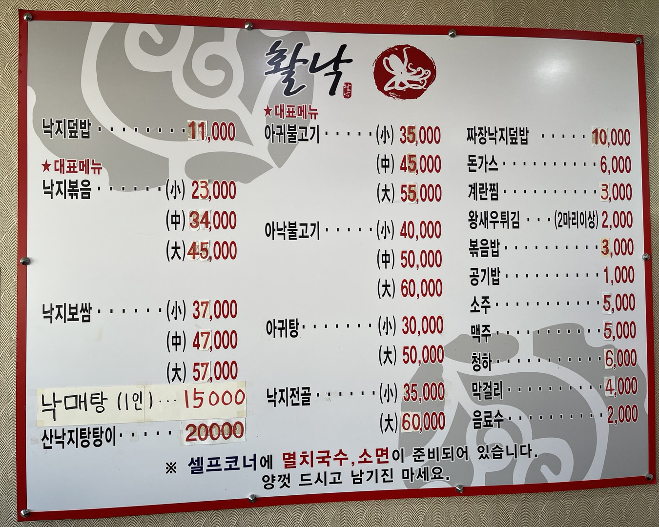 활낙 김포통진점 메뉴입니다.