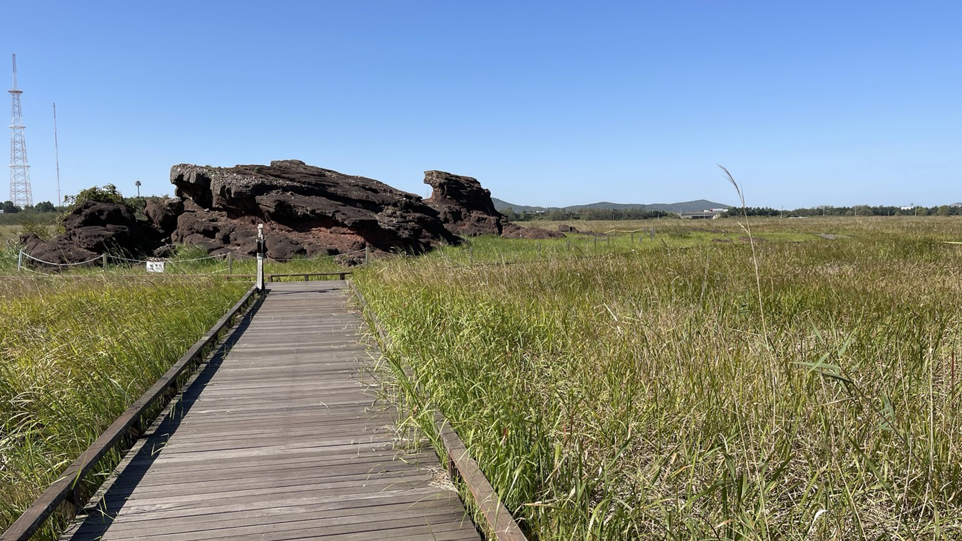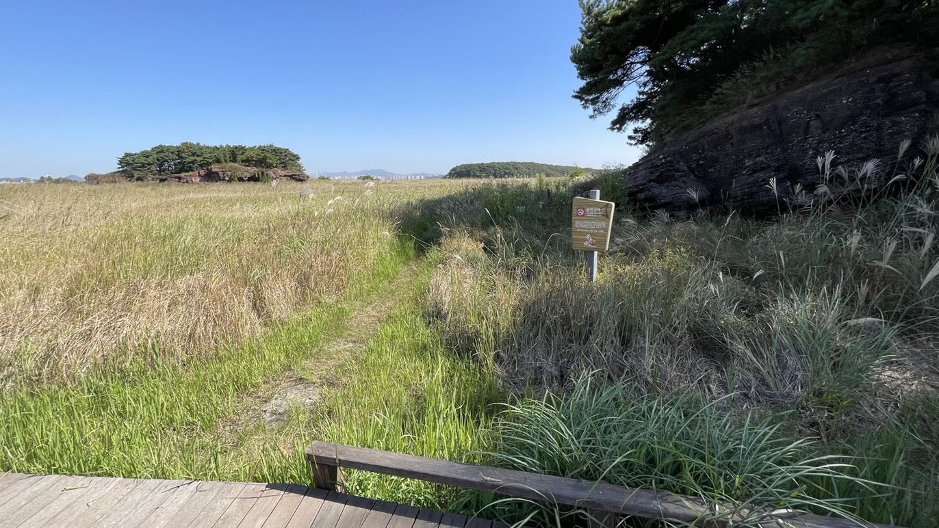 산책로는 공룡알화석산지 사이를 가로질러 낮은 데크길로 이어져 있습니다. 데크길 주변으로 갈대와 들풀, 염생식물 등이 넓게 분포되어 있어요.