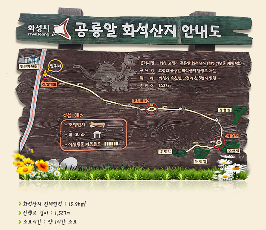 공룡알화석산지 산책로 길이는 약 1.5km로 약 1시간 정도의 시간이 소요됩니다.