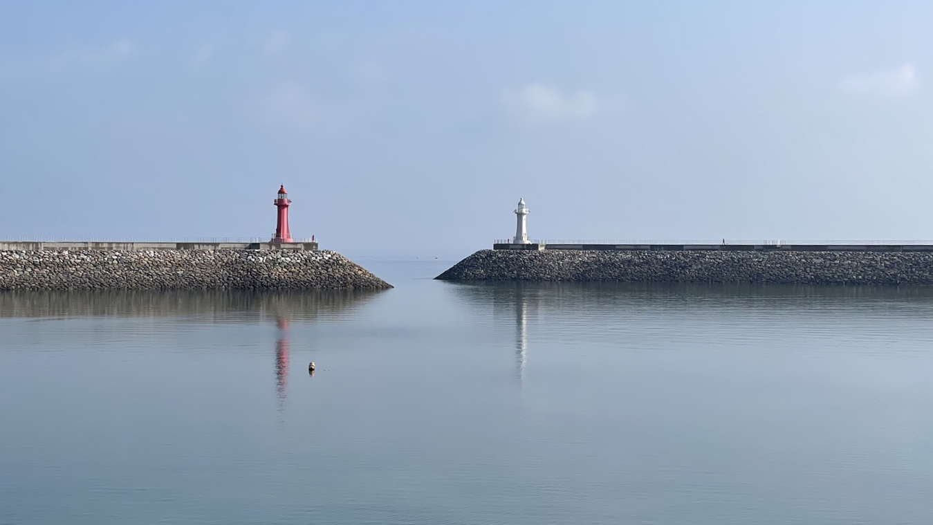 멀리 등대 2개가 쌍둥이처럼 서 있습니다. 방파제 한 가운데는 막혀 있지 않아 그 사이로 배가 들어왔다 나갔다 합니다.