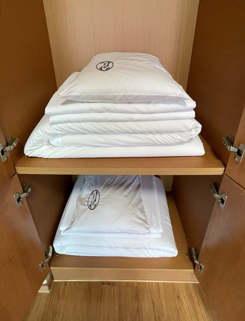 하얗고 바스락한 느낌의 침구가 깔끔하게 정리되어 있습니다.