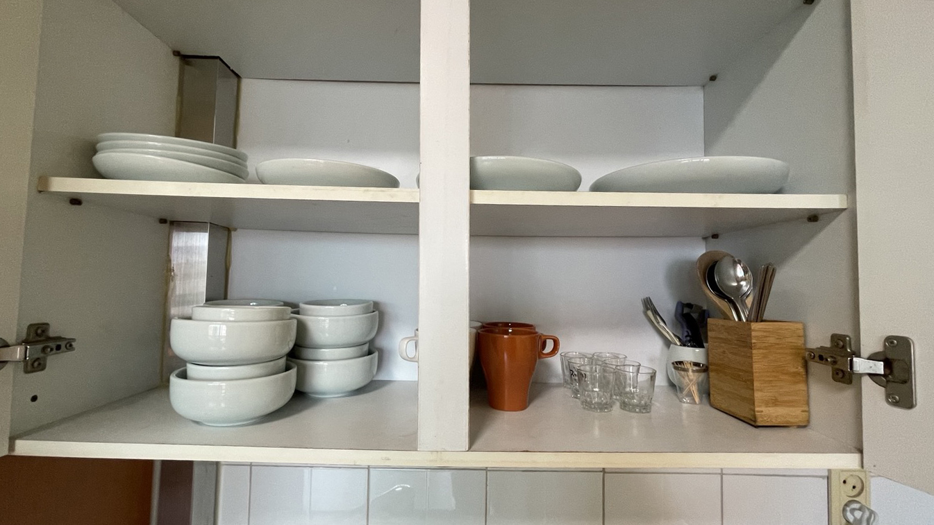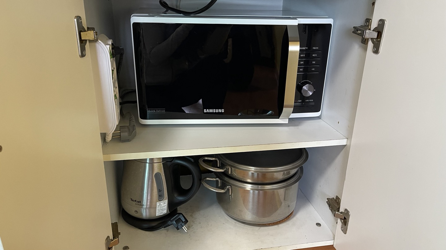 전기밭솥, 전자렌지, 전기주전자 등의 가전제품과 그릇, 조리기구 등이 준비되어 있습니다.