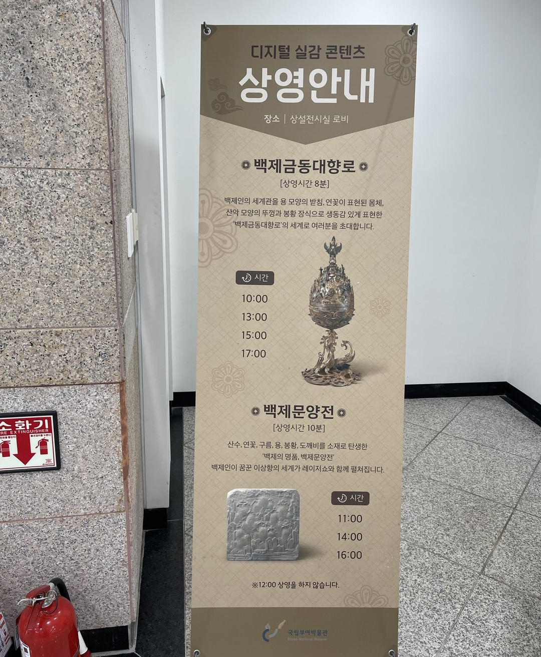주제는 '백제금동대향로'와 '백제문양전'으로, 상영시간은 8분, 상영 시작 10분 전에 방송으로 안내해줍니다. 전시물 관람하다가 방송이 나오면 슬슬 로비에 자리를 잡으면 되요~