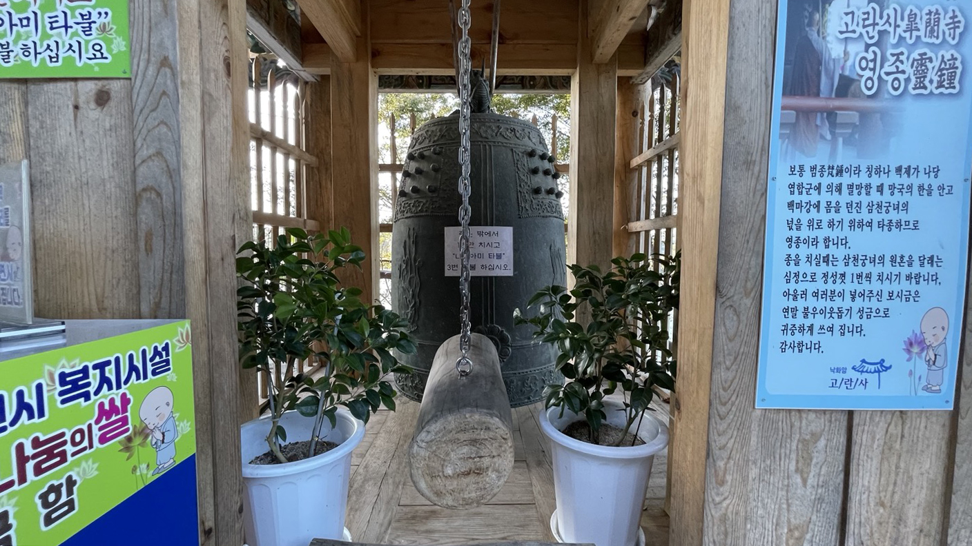 '고란사 영종'은 백제가 나당연합군에 의해 멸망할 때 망국의 한을 안고 백마강에 몸을 던진 삼천궁녀의 넋을 위로하기 위해 타종하므로 일반적인 명칭인 '범종'이라 부르지 않고 특별히 '영종'이라 부른다고 해요.