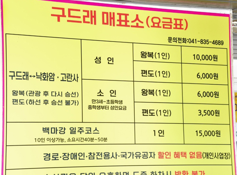 구드래 나루터에서 운행하는 부여유람선 요금표에요.