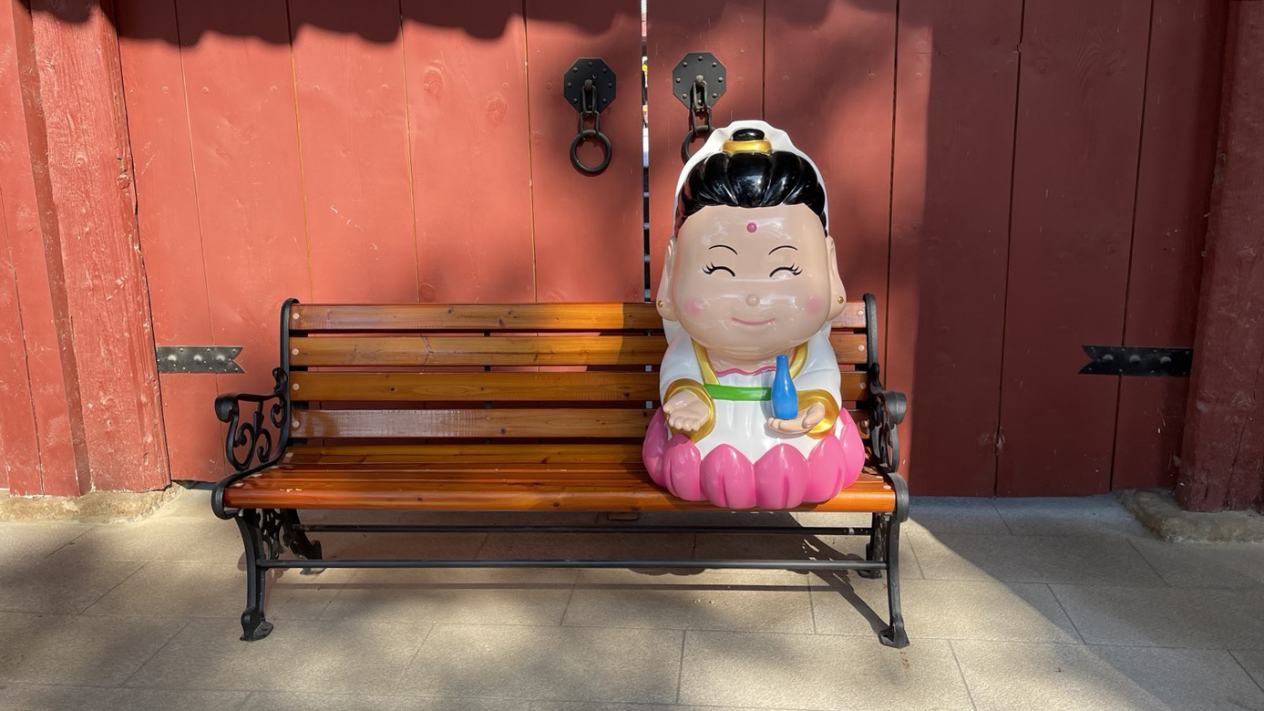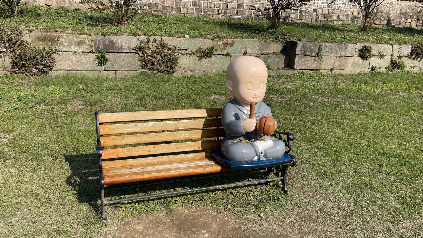 천불전(千佛殿) 옆 벤치에 있는 동자승 조형물이 귀여워 가까이 가봤더니 동자승 양반다리 위로 사탕 여러 개가 놓여 있었어요.ㅎㅎ 사탕을 두고 간 사람들의 마음이 참 귀엽습니다.^^