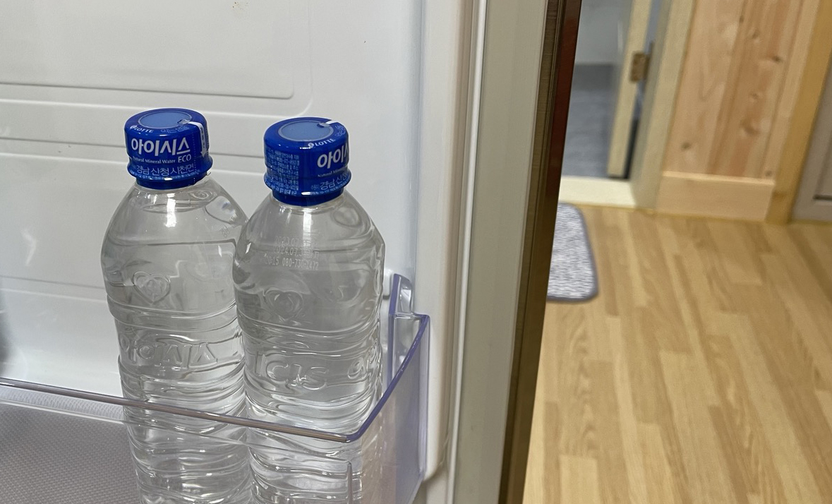 냉장고 열어보니 작은 생수 2병 들어있네요.^^