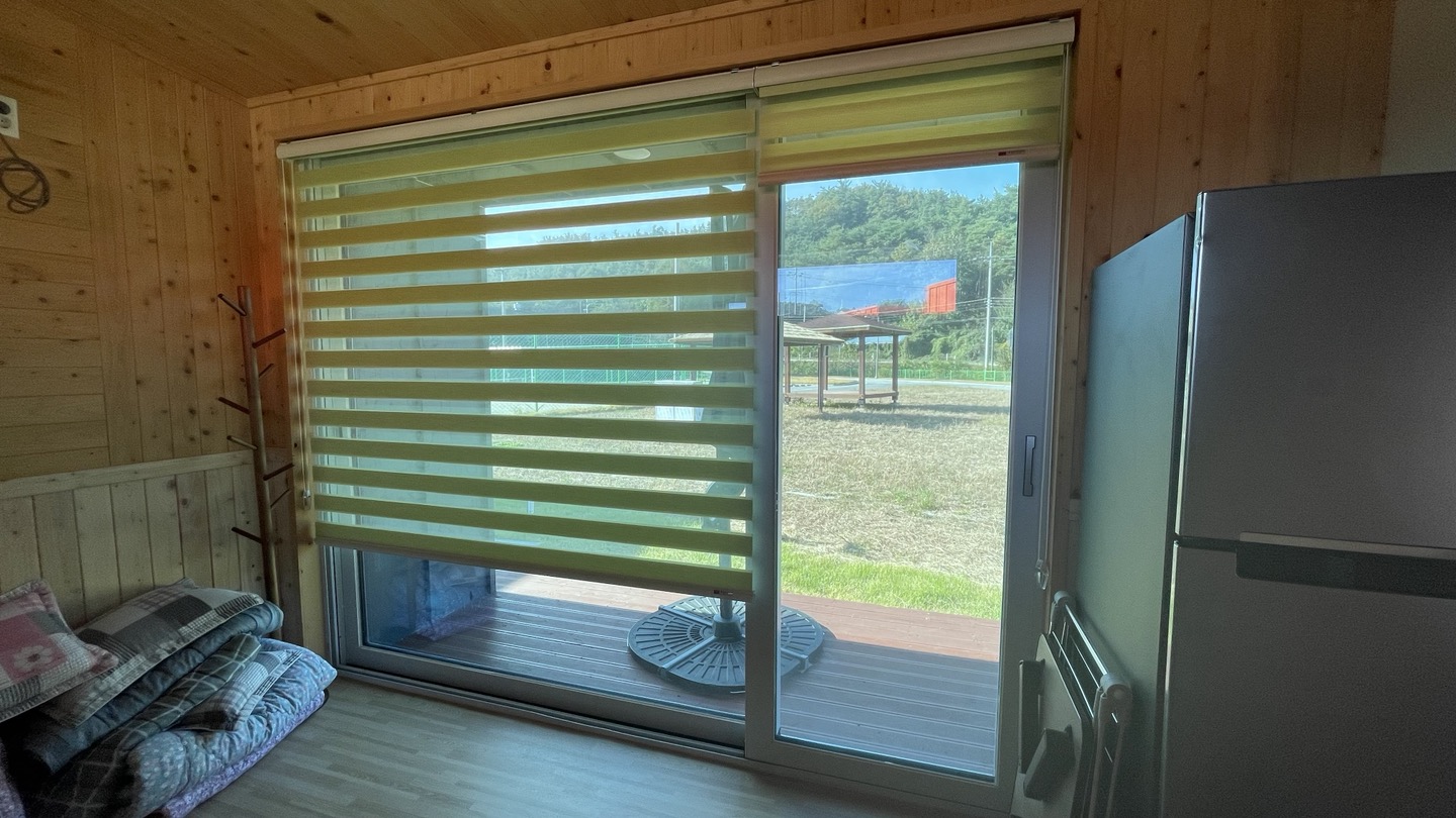 벽면 한쪽은 반 이상이 창으로 되어 있어요. 개방감이 있어 좋다는 장점과, 객실 앞을 지나다니는 사람들이 내부를 다 볼 수 있어 사생활 보호가 안된다는 단점이 있습니다.