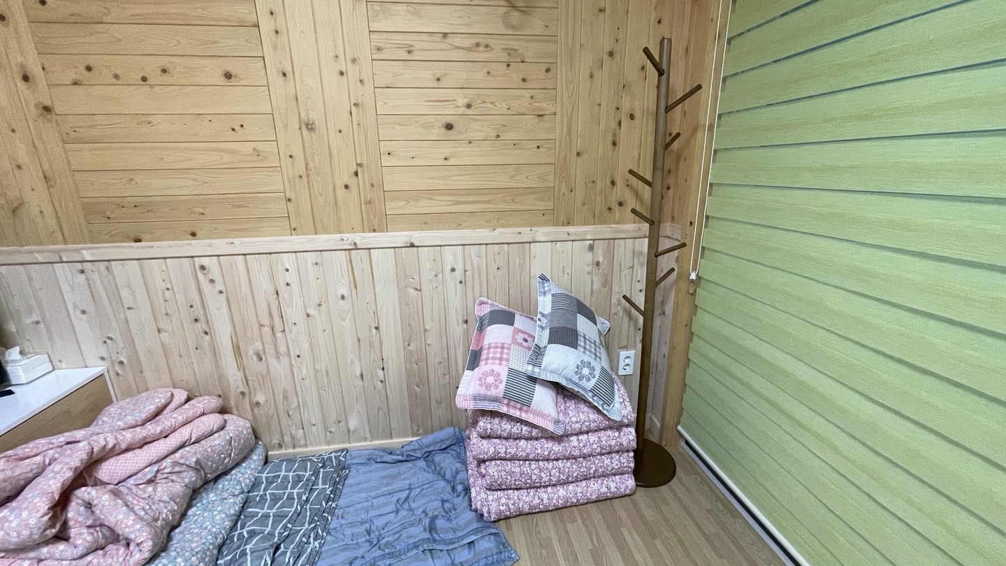 밤날씨가 꽤 쌀쌀한 계절이라 그런지 저녁에 도착하니 객실 바닥이 많이 차갑게 느껴졌습니다. 급한대로 이불을 깔아놔서 어수선해 보이는데요, 침구도 4인에 맞게 깔끔하게 준비되어 있었습니다.