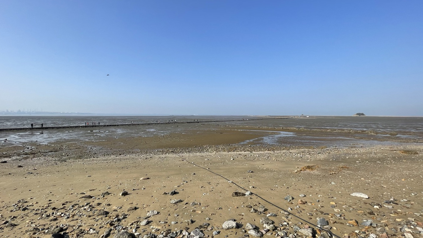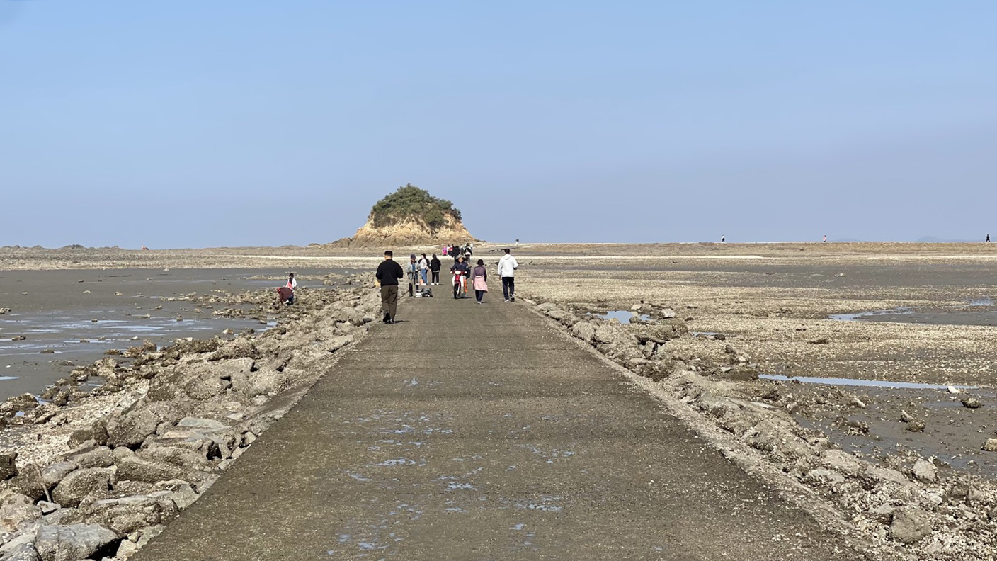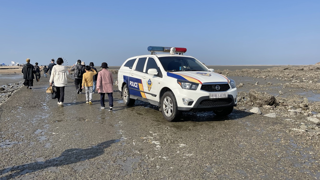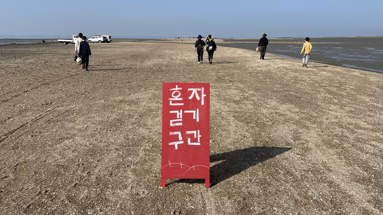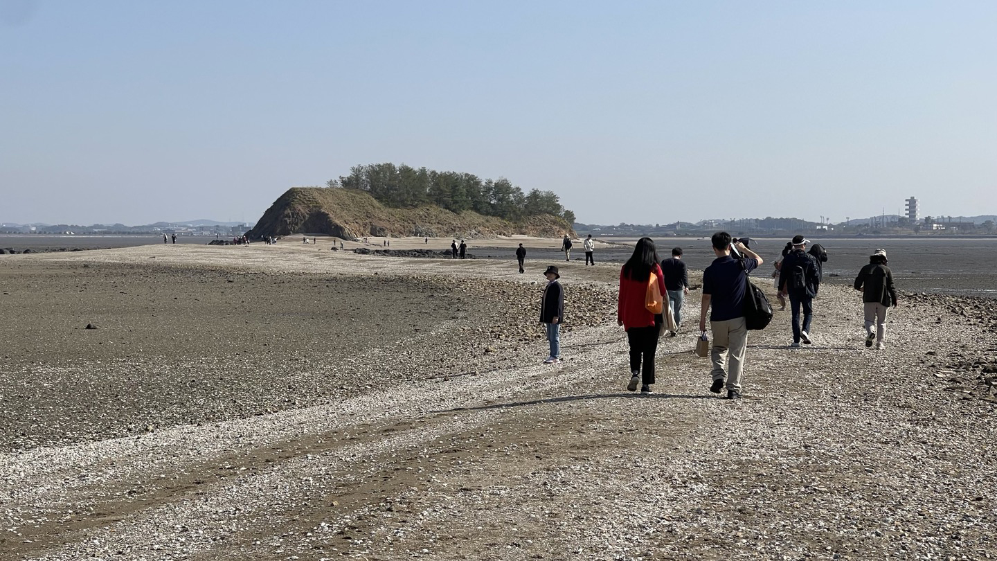 갯벌 사이로 길게 뻗어있는 바다길을 따라 이미 걷기를 시작한 사람들이 멀리 보입니다.
