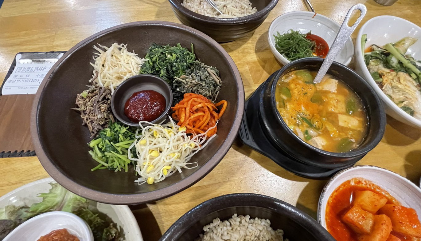 나물 잔뜩, 고추장 한숟가락 척, 쓱쓱 비비면 딱히 특별하진 않지만 언제 먹어도 맛있는 비빔밥이 되죠. 같이 나온 된장찌개까지 넣어서 비비면 더 맛있는 것 같아요.^^