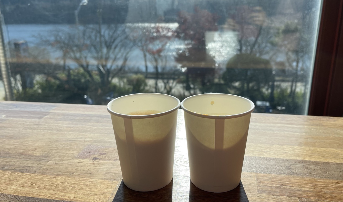 서비스로 받은 커피를 가지고 2층에 있는 휴게실로 갔어요. 휴게실 창문으로 대왕저수지 풍경이 보입니다.