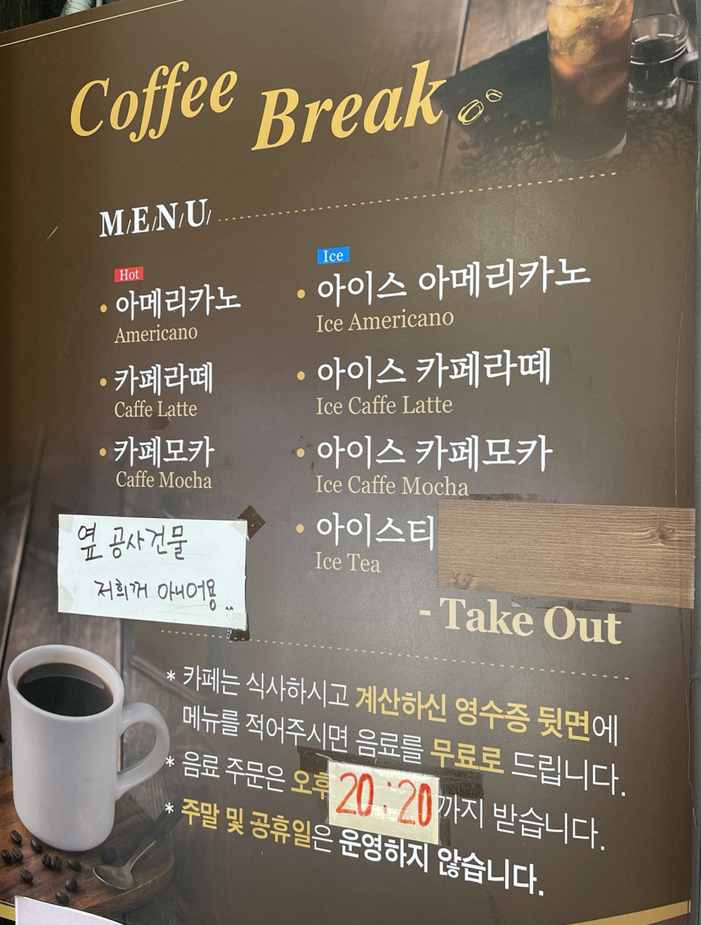 식사가 끝나고 계산 영수증을 보여주면 무료로 음료서비스를 받을 수 있습니다.